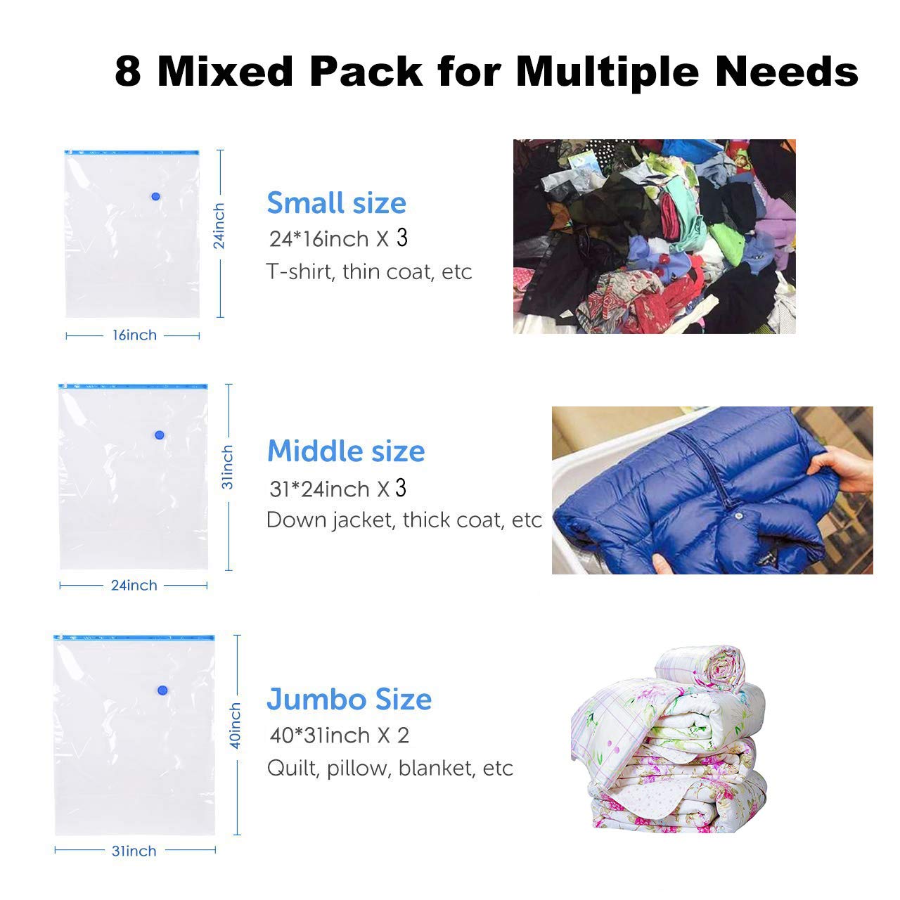 📌 BOLSA AL VACÍO COMPRESION AL VACÍO. ESTA BOLSA DE ALMACENAMIENTO DE COMPRESION SUSPENDIDA PUEDE ALMACENAR TODO TIPO DE ABRIGOS , ROPA , FRAZADA Y EDREDONES BAJO VACÍO. SE PUEDE ALMACENAR VARIAS VECES AL MISMO TIEMPO Y PUEDES AHORRAR MAS ESPACIO EN EL ARMARIO