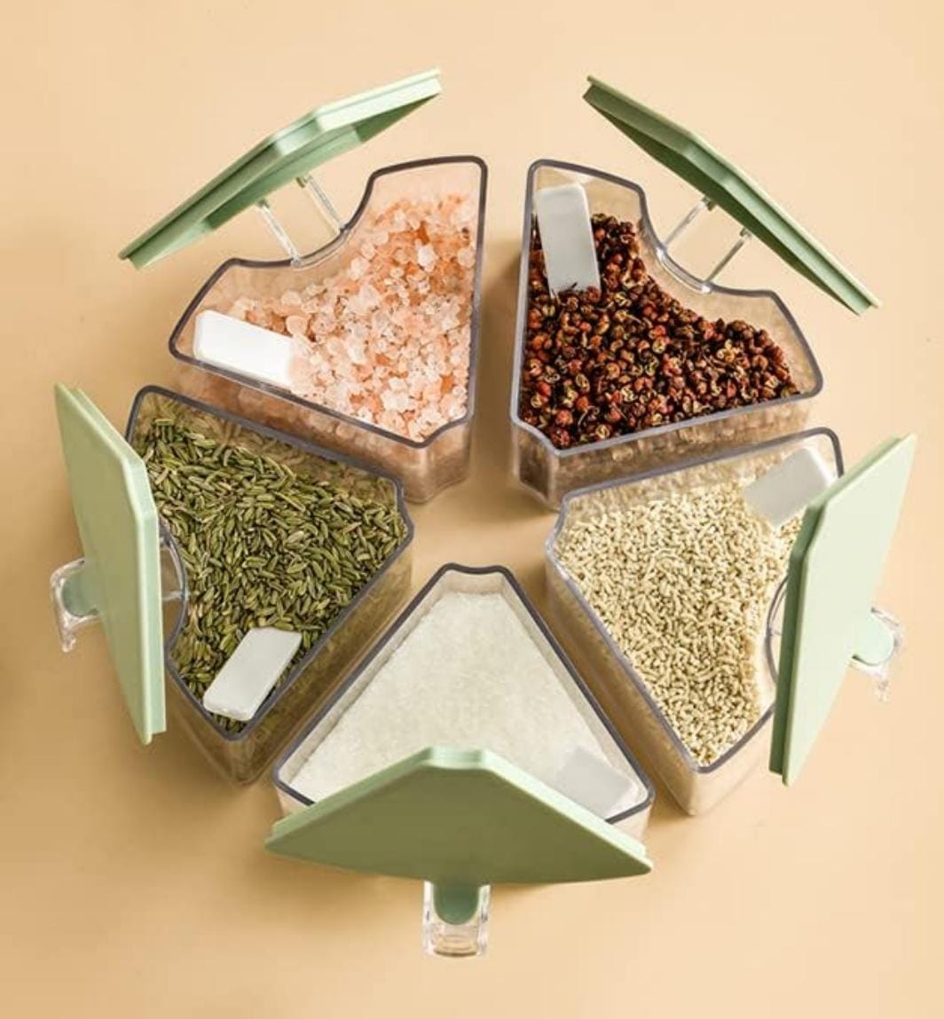 este estante para condimentos y el estante para cuchillos pueden girar 360° para un fácil acceso. Hay cinco cajas de condimentos separadas, incluyendo cucharas, que pueden satisfacer las necesidades de condimentos diarios